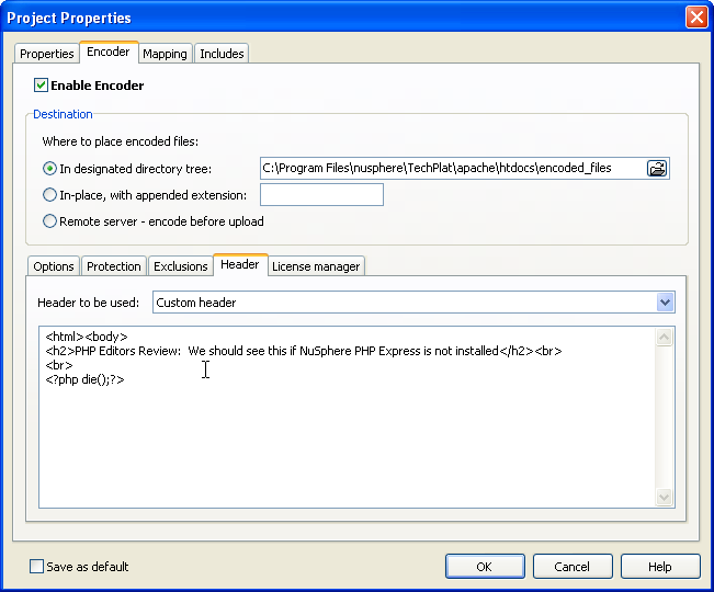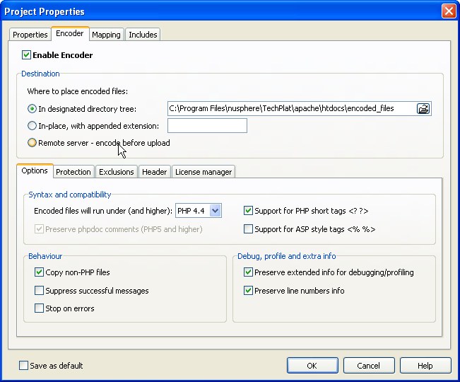 Nu-Coder is integrated with PhpED on the Project Level. All Encoder configurations can be done in Encoder tab of PhpED's Project Properties dialog. New UI in PhpED 5.5 provides the interface to both encoder and License Manager. Encoder tab of Project Properties has Destination group of options used to specify where you want to store your encoded files and 5 sub-tabs used to specify the way you want to encode the files.