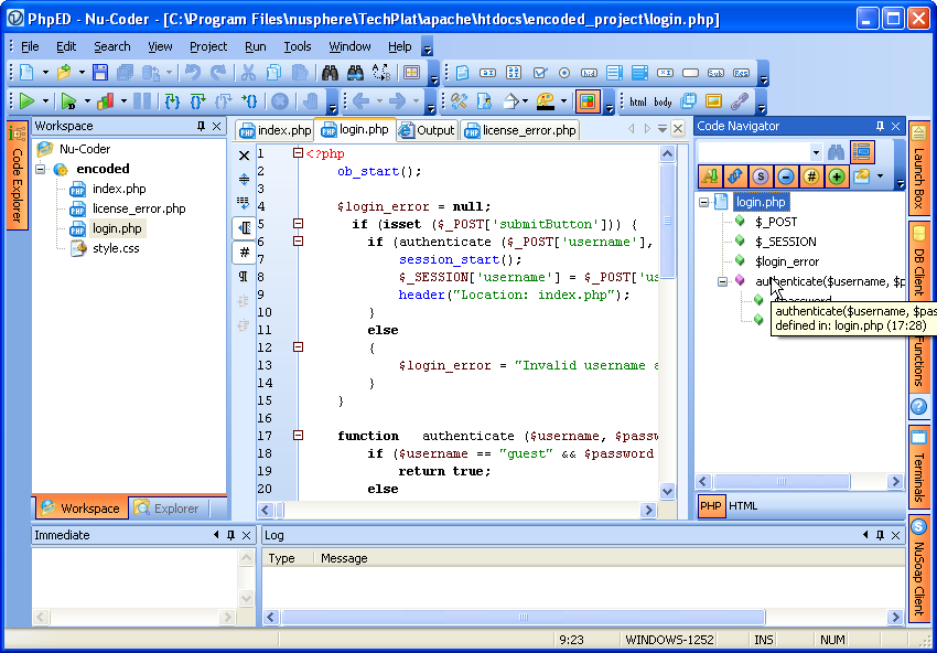 We tasked ourselves with encoding of a simple PHP application and took Nu-Coder 2.0 for the ride along using the User Interface in PhpED 5.5. Our test PHP Application is a simple login form consisting of 3 php files and a style sheet. Here is how our project looks like in PHP IDE: